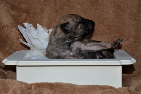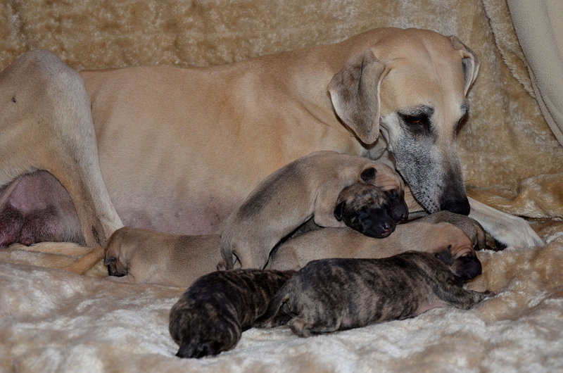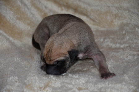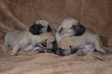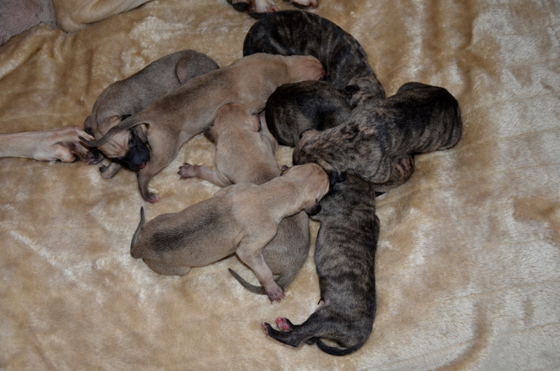 | Endlich sind sie da, unsere kleinen J's. Es sind 5 Rüden (3 sandfarben, 2 gestromt) und 3 Hündinnen (1 sandfarben, 2 gestromt). | |