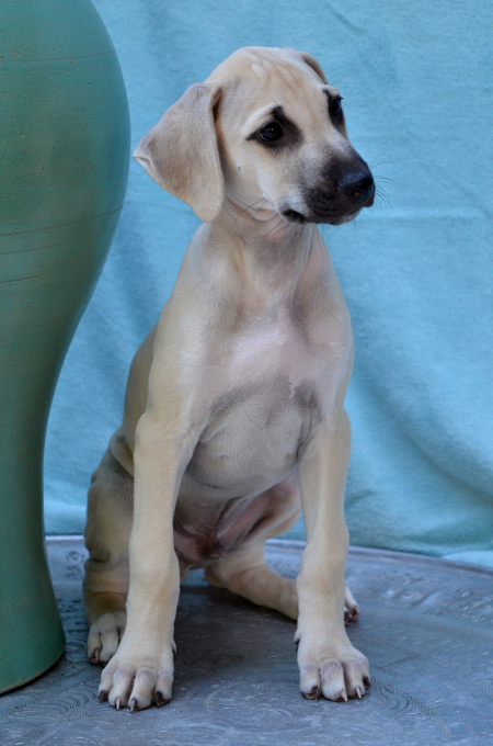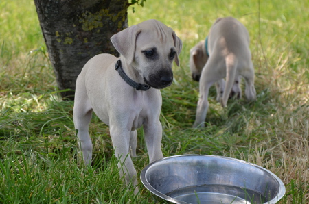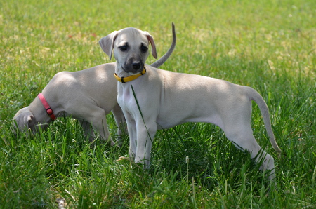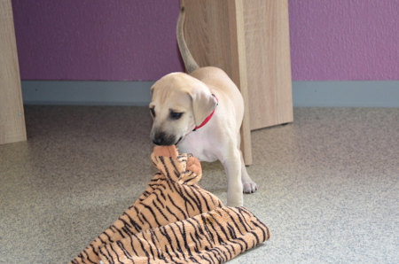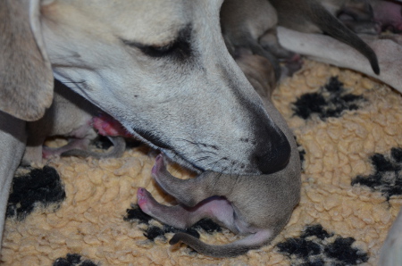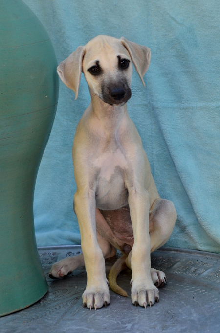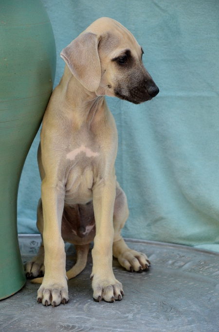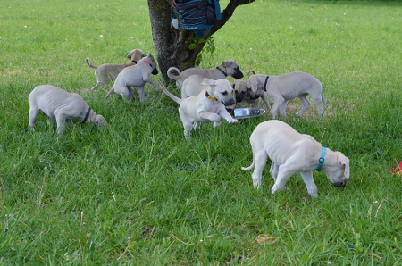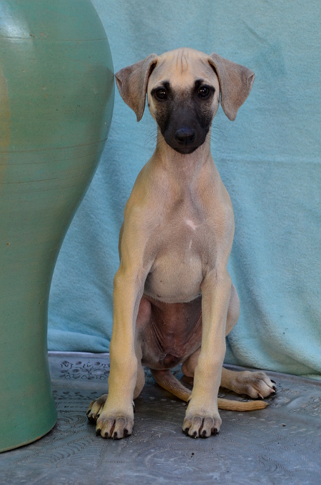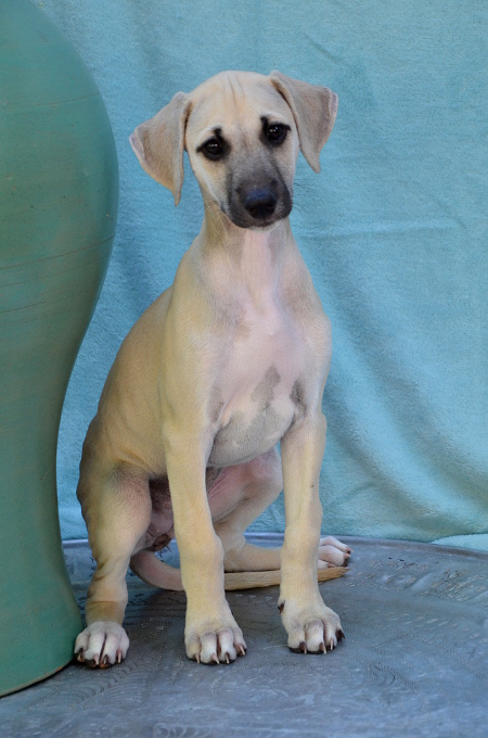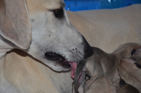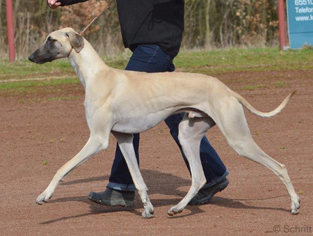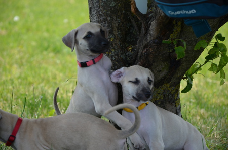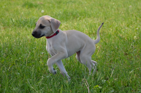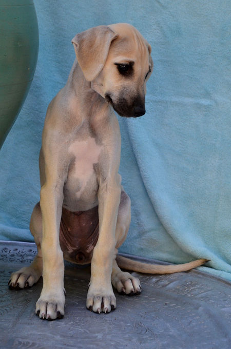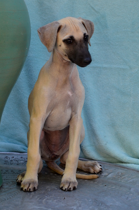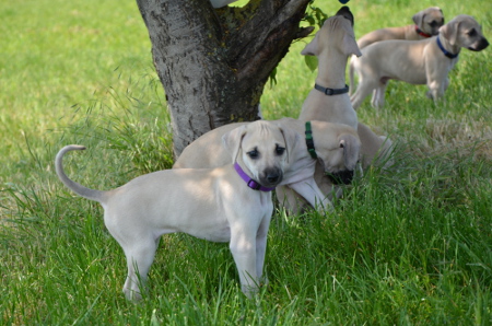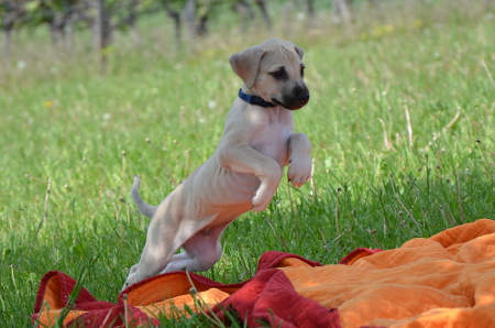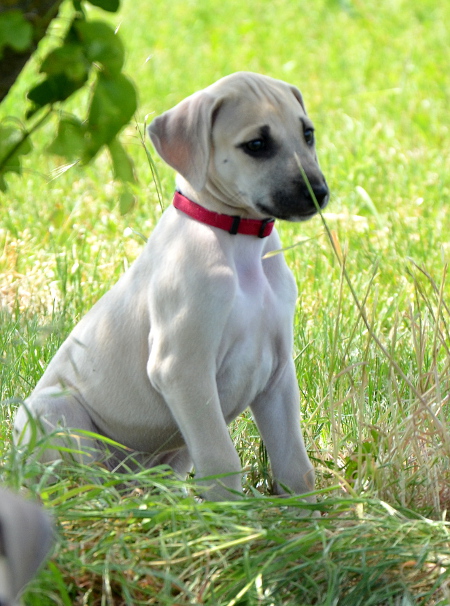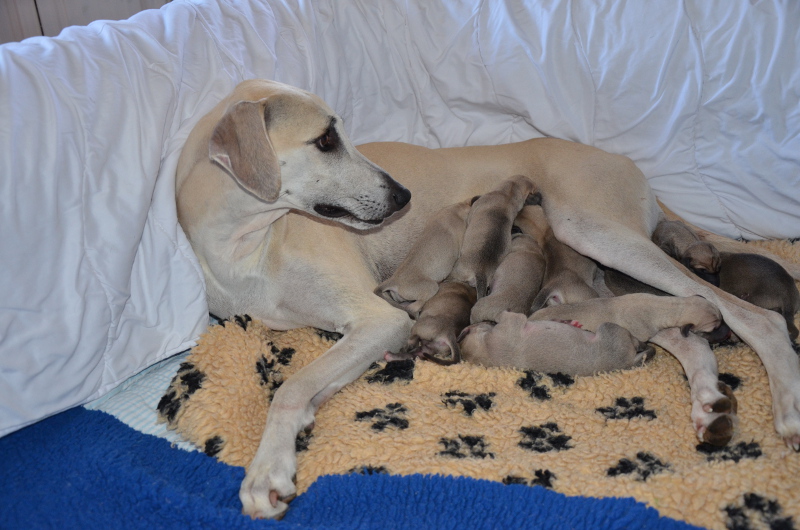 unsere 11 Aprilscherze auf die Welt. Es sind 5 Rüden und 6 Hündinnen. Dieses Mal fiel uns die Wahl einen passenden Rüden für unsere Izzi zu finden, besonders schwer! Izz al-Din ist eine große und kräftige Hündin. So sollte der Rüde eher elegant und nicht zu groß sein, aber dennoch ein Rüde darstellen. Nach langer Suche und vielem Hin und Her haben wir in Kamran dann einen mehr als würdevollen Vertreter gefunden! Izzi trägt unser heißgeliebtes nordafrikanisches Blut weiter und Kamran stammt aus den besten deutschen Linien. Wir hoffen auf substanzvolle und gesunde Welpen aus dieser Verpaarung! Mama Izzi macht mit ihren 11 Kindern einen verdammt guten Job - alle wachsen und gedeihen prächtig! |