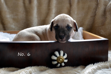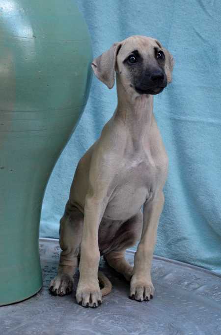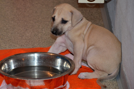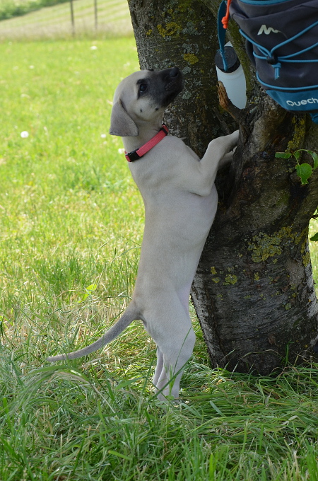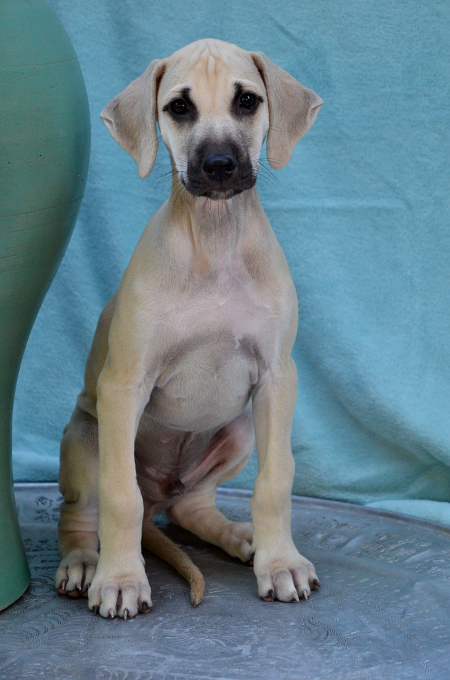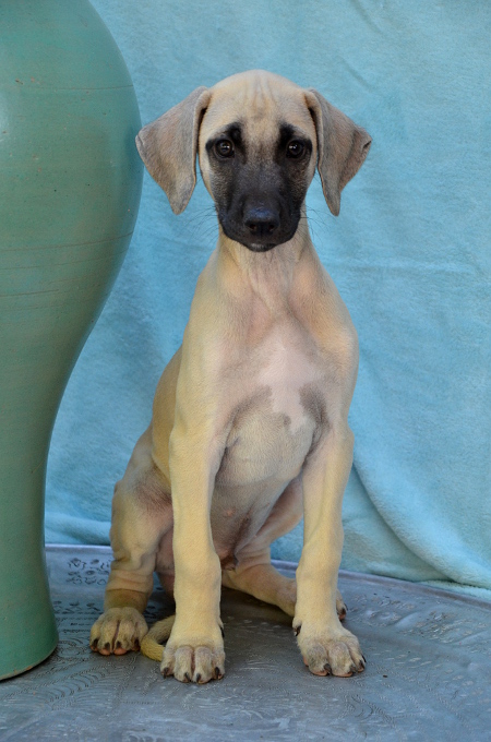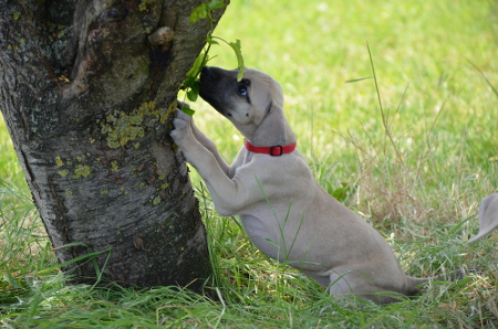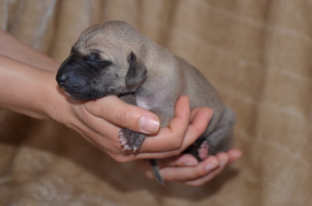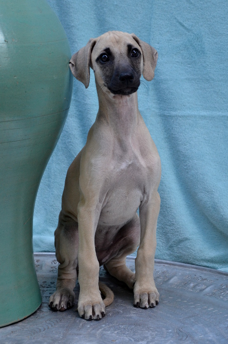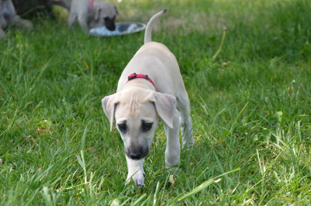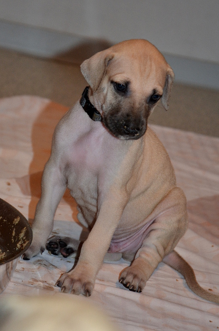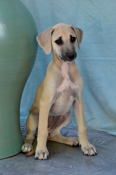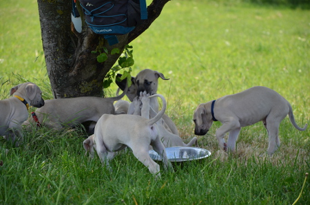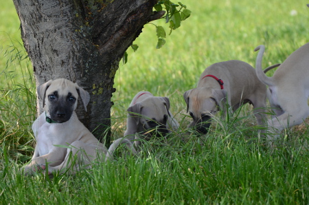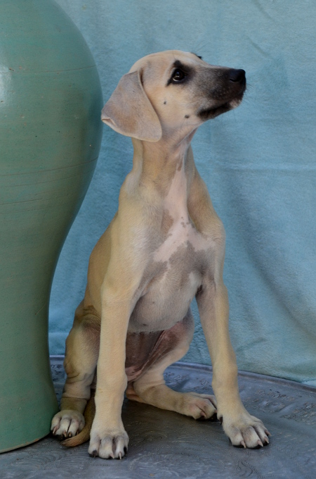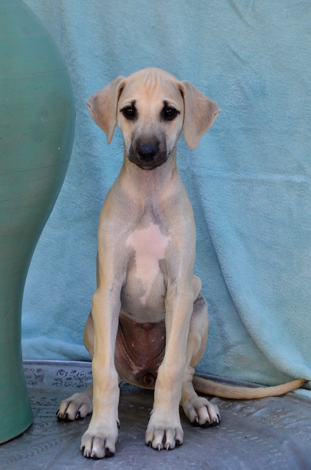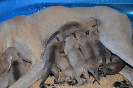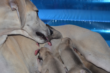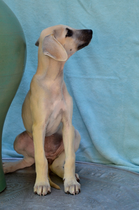 unsere 11 Aprilscherze auf die Welt. Es sind 5 Rüden und 6 Hündinnen. Dieses Mal fiel uns die Wahl einen passenden Rüden für unsere Izzi zu finden, besonders schwer! Izz al-Din ist eine große und kräftige Hündin. So sollte der Rüde eher elegant und nicht zu groß sein, aber dennoch ein Rüde darstellen. Nach langer Suche und vielem Hin und Her haben wir in Kamran dann einen mehr als würdevollen Vertreter gefunden! Izzi trägt unser heißgeliebtes nordafrikanisches Blut weiter und Kamran stammt aus den besten deutschen Linien. Wir hoffen auf substanzvolle und gesunde Welpen aus dieser Verpaarung! Mama Izzi macht mit ihren 11 Kindern einen verdammt guten Job - alle wachsen und gedeihen prächtig! |