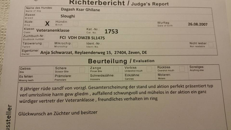 Dagash Ksar Ghilane V1, Vet. VDH, Vet. CAC, Vet. BOB & BOS Damit erfüllt Dagash mit nur 3 Ausstellungen die Voraussetzungen für den VDH- und DWZRV-Veteranenchampion! |