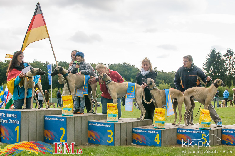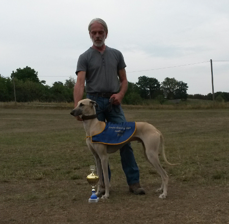 Deutschland die diesjährige EM statt. Ganoosh Areen Ksar Ghilane hatte seine 2 Qualiläufe dafür absolviert und vertrat Ksar Ghilane bei diesem großen Event. Dabei sein, ist schließlich alles! Und es passierte, woran keiner zu träumen wagte... Nach einem super Vorlauf und einem phänomenalen Halbfinale, legte er auch im Finale einen sensationellen Lauf hin und gewann! Somit wurde er FCI Europameister 2015! Selbst jetzt (Monate später) bekomme ich beim Schreiben dieses Berichtes eine Gänsehaut! |