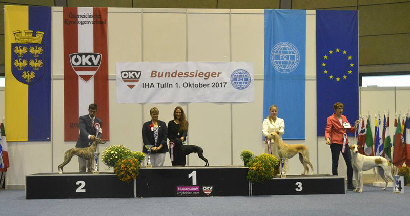 Bundessieger hat Peppi dieses Jahr den Vogel abgeschossen! :-) Feltou Ksar Ghilane V1, CACA, CACIB, Bundessieger 2017, BR, BEST OF BREED und schlussendlich beendete er den Tag mit den Worten der Richterin Fr. Desserne/F "I love his movement - he is a real mover!" mit dem BEST OF GROUP X. Ich persönlich war gar nicht dabei, aber allein bei der Vorstellung und dem momentanen Bearbeiten der HP bekomme ich eine Gänsehaut! Wir können unser Glück kaum fassen! Meine besonderen Glückwünsche gehen an seine Besitzerin Kristina, die übrigens nun auch ganz offiziell Mitglied unserer Zwingergemeinschaft ist. :-) "Kristina, vielen Dank, dass du Peppis Talente so toll gefördert hast und somit seine Qualitäten wunderbar zur Geltung kommen!" |
