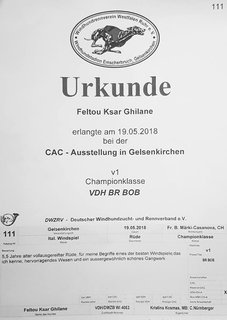 Ghilane Aufgrund seiner konstanten und hervorragenden Leistungen wurden ihm die Leistungsurkunde im Rennen (LU) und die Leistungsurkunde im Coursing (CLU) zugesprochen. Herzlichen Glückwunsch! |