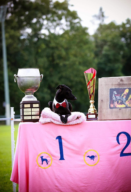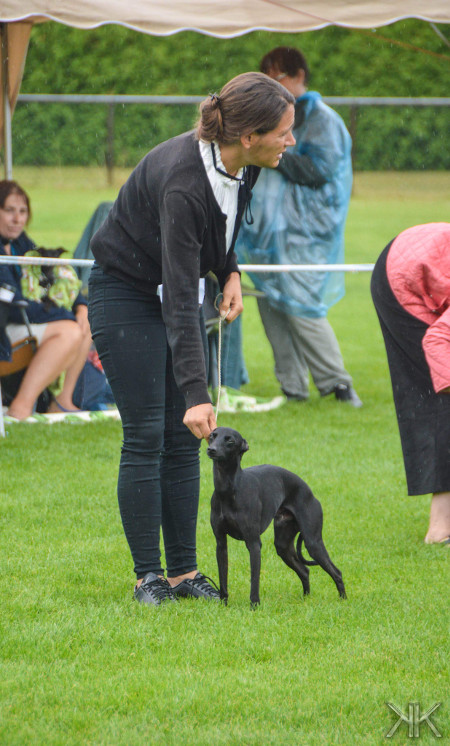 Windspiel Jahresausstellung in Ingolstadt am 21. Juli Überall in Deutschland schien die Sonne, nur in Ingolstadt nicht... War ja klar, schließlich fand dort die diesjährige Windspiel Jahresausstellung statt und wie allseit bekannt ist, lieben Windspiele ja den Regen... :-( Trotz der widrigen Bedingungen brachte Peppi die Sonne mit und zeigte sich von seiner Schokoladenseite. Er konnte seinen Titel vom Vorjahr verteidigen und wurde Windspiel Jahressieger 2018! Nachdem der Regen endlich nachließ, posierte er auch noch, wie eine Prinzessin auf der Erbse, als Model mit seinen Siegestrophäen. Vielen lieben Dank an Stefanie Bauer für die tollen Fotos! |