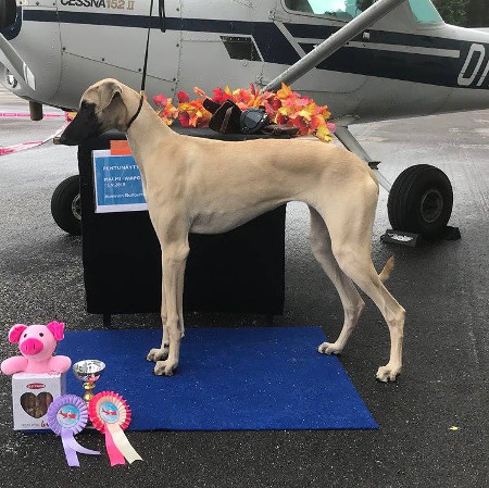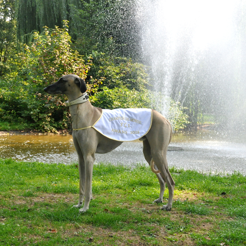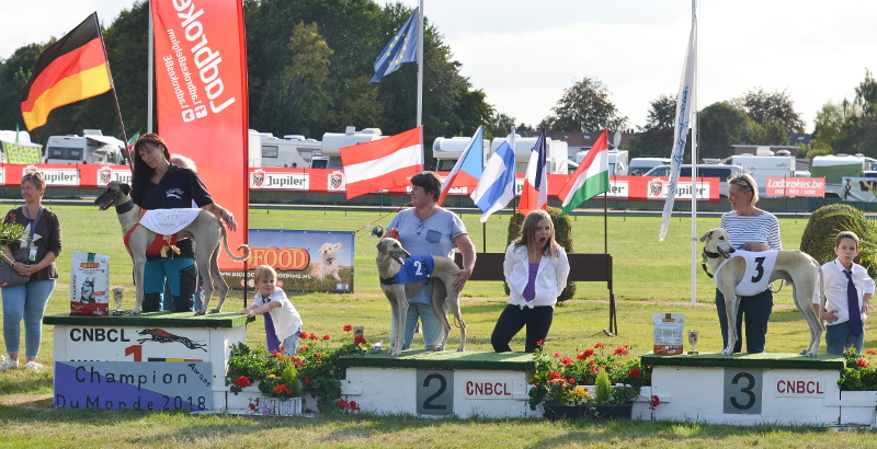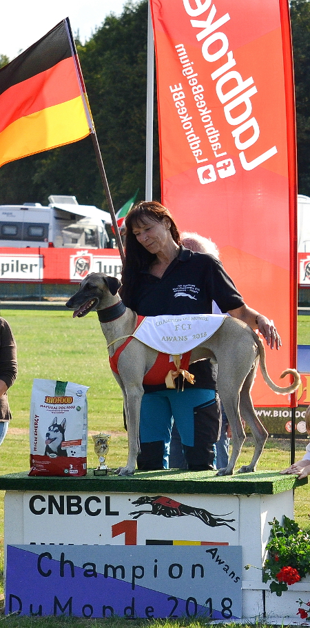 2018 in Awans/Belgien am 31. August Ganoosh Areen Ksar Ghilane schaffte, was nur wenige Windhunde in ihrem Leben schaffen! Er konnte seinen WM Titel von 2016 verteidigen und wurde somit FCI Weltrennsieger 2018! Und damit nicht genug! Er unterbot mit einer Zeit von 33,068 sek auch noch seinen eigenen Bahnrekord vom Mai! Wir können unser Glück kaum fassen und gratulieren Anja ganz herzlich zu diesem großartigen Erfolg! Außerdem danken wir ihr für ihre wahnsinnige Mühe, die sie sich mit den Hunden macht und diese immer perfekt und auf den Punkt darauf vorbereitet! |