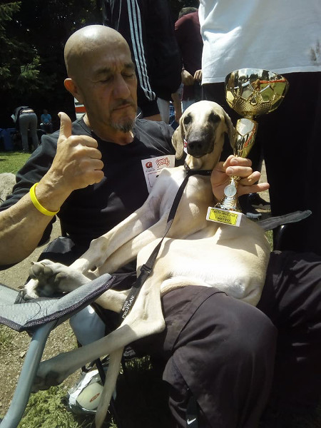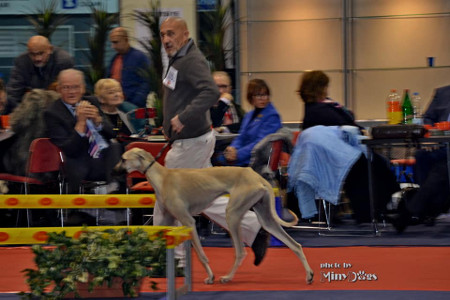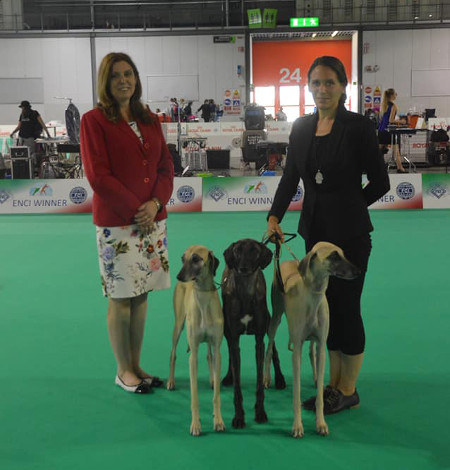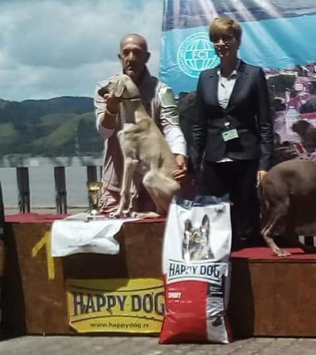 Juni machte sich Habibi Hafid al Vaha Ksar Ghilane ganz alleine mit Kristina und ihren Mädels auf den Weg zu einer 3tägigen Ausstellung nach Mailand. Kristina hat mit ihrer gewohnt gekonnten Art das Beste aus ihm heraus geholt und sie waren sehr erfolgreich! Tag 1 - V1, CAC, CACIB & Bester Rüde Tag 2 - V1, CAC, CACIB, Enci Winner 2018 & Bester Rüde Tag 3 - V1, CAC & Bester Rüde Und damit ist er frisch gebackener Italienischer Champion! Er ist der erste Sloughi Rüde aus Deutschland, der diesen Titel trägt! |